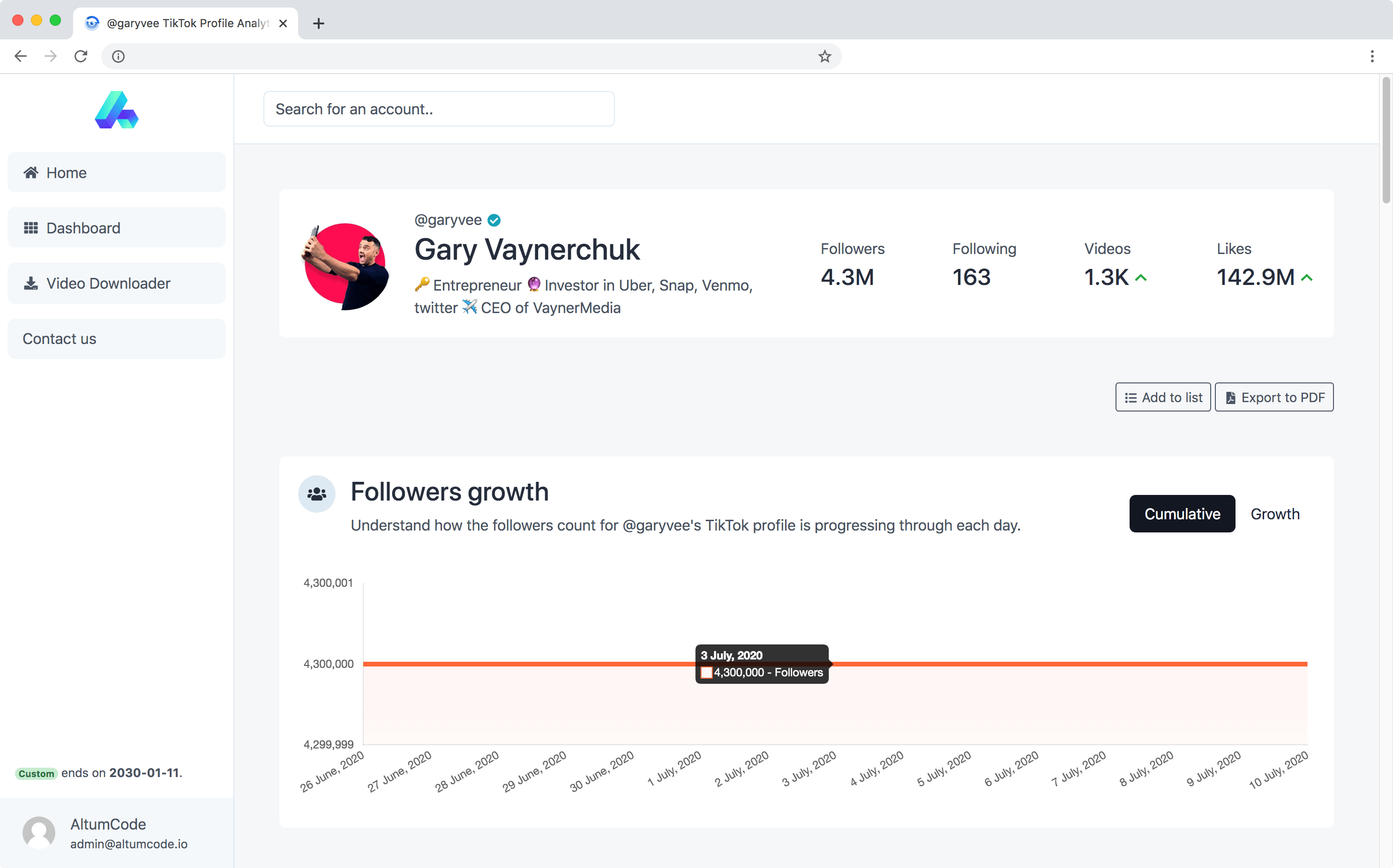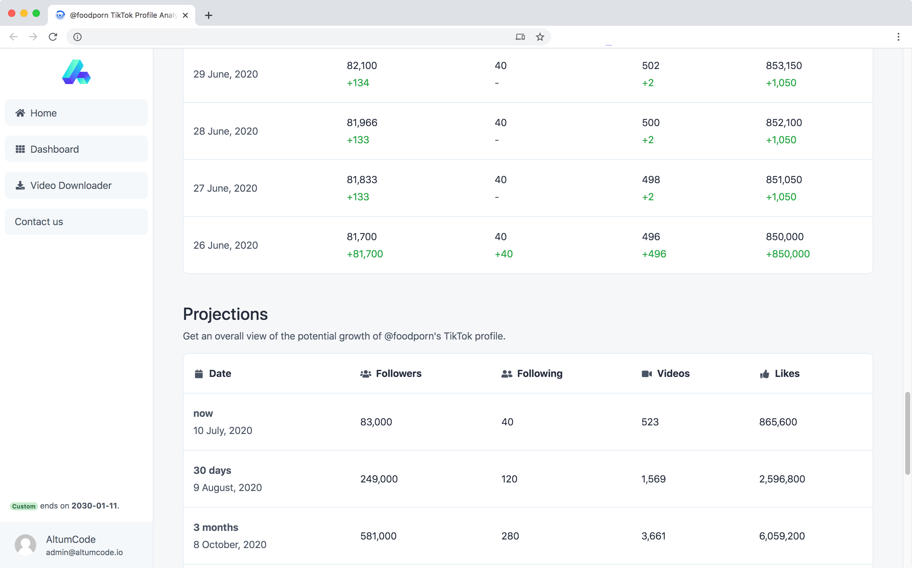 Get access to all the stats we've gathered from a TikTok profile, including past and future projections.
